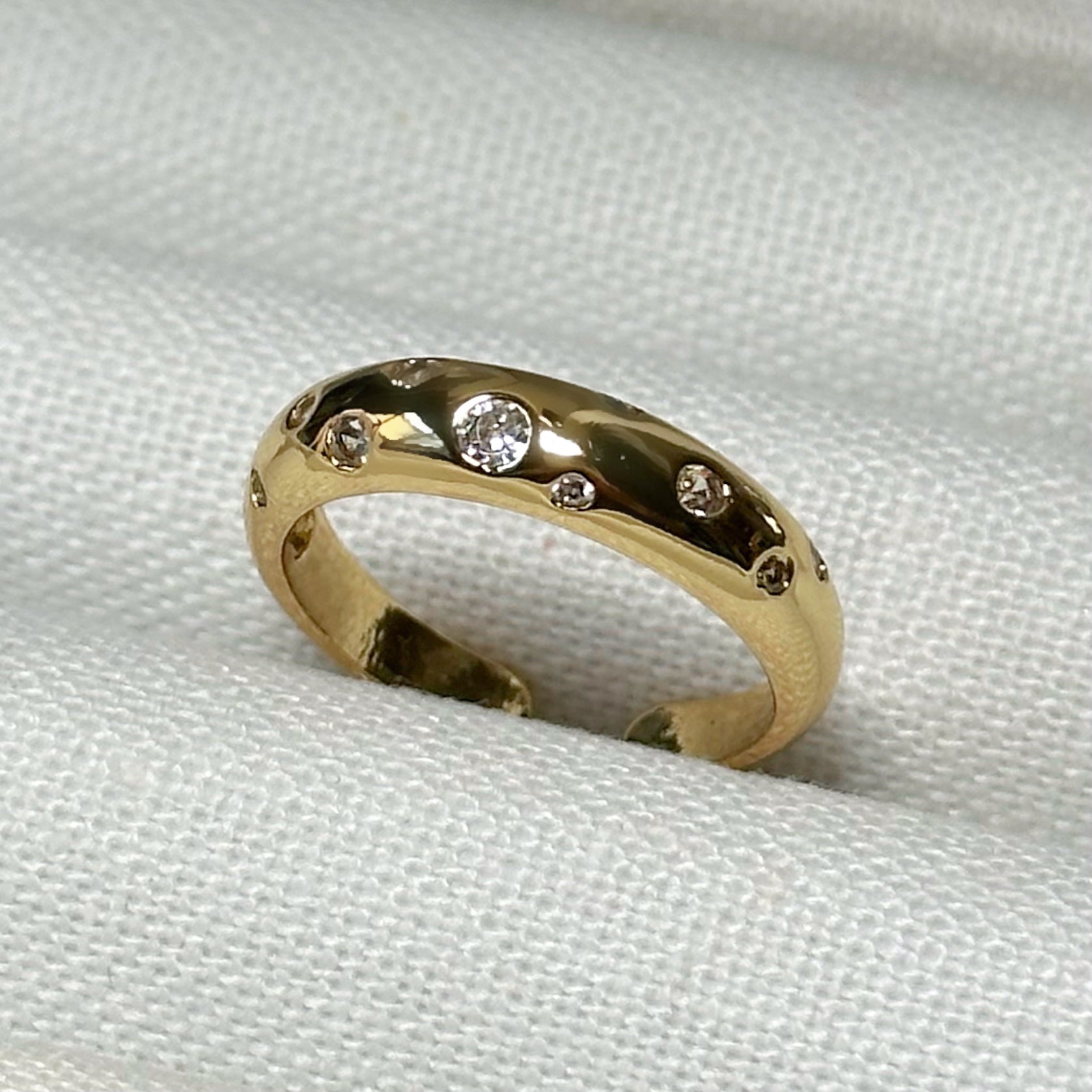 This luminous domed ring has a smooth, golden curve which catches the light beautifully, while the scattered diamonds glimmer like tiny stars. The adjustable band makes it effortlessly comfortable and perfect for gifting, offering a custom feel without the fuss of sizing. Elegant, meaningful, and endlessly wearable, it’s the kind of piece that instantly lifts your look.